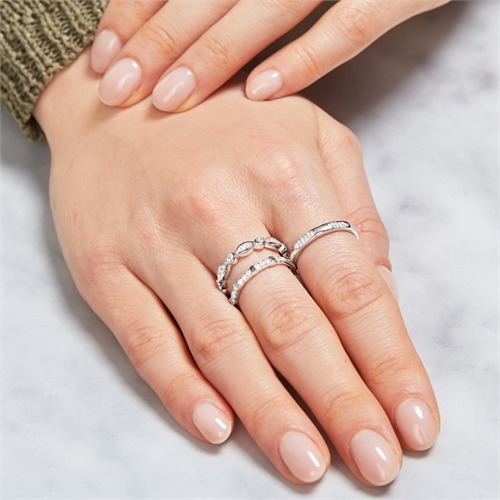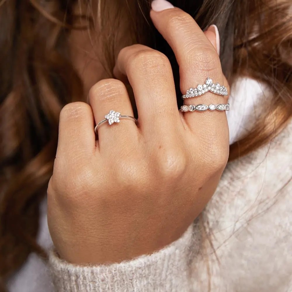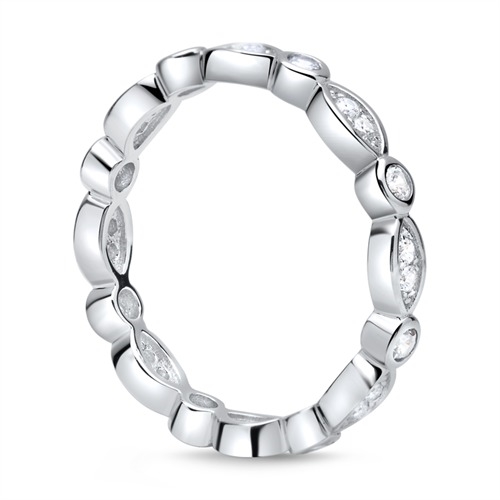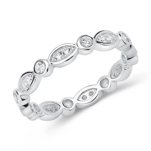 Allianceringens overflade er poleret og den er besat med funklende runde og ovale zirkoniasten