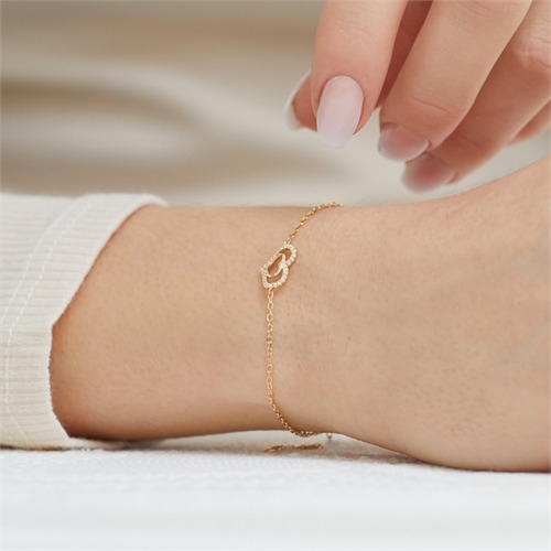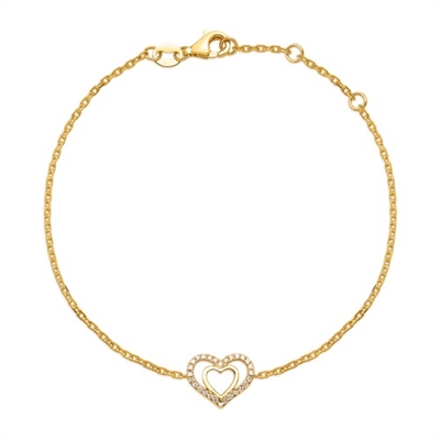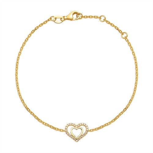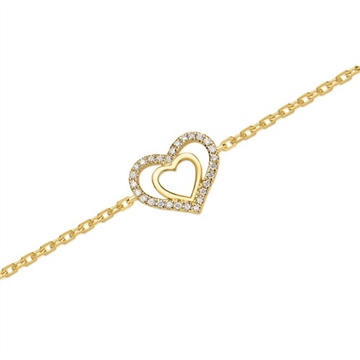 Smukt armbånd i guld med hjerte i hjertet. Det ene hjerter er besat med 28 funklende diamanter
