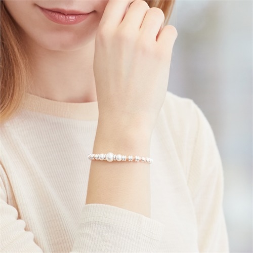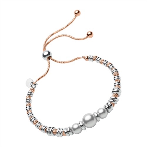 Raffineret armbånd i sølv med et mix af rosaforgyldte og sølvkugler samt hvide perler
