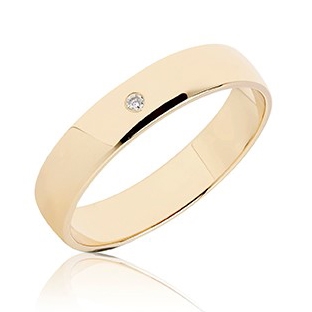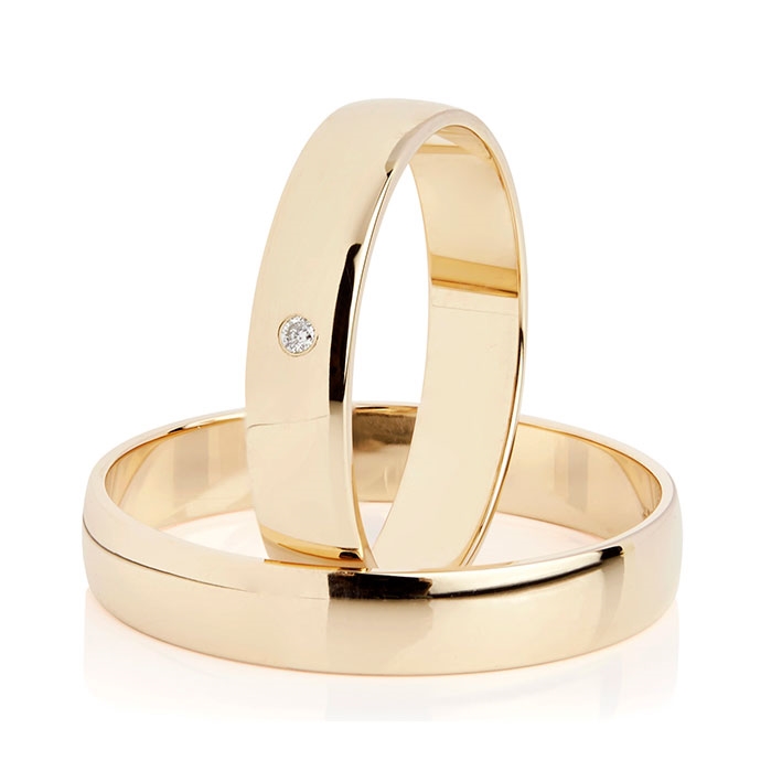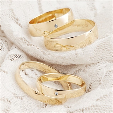 Klassiske vielsesringe i 8 kt. guld med diamant 0,01 ct. w/si fattet i dameringen