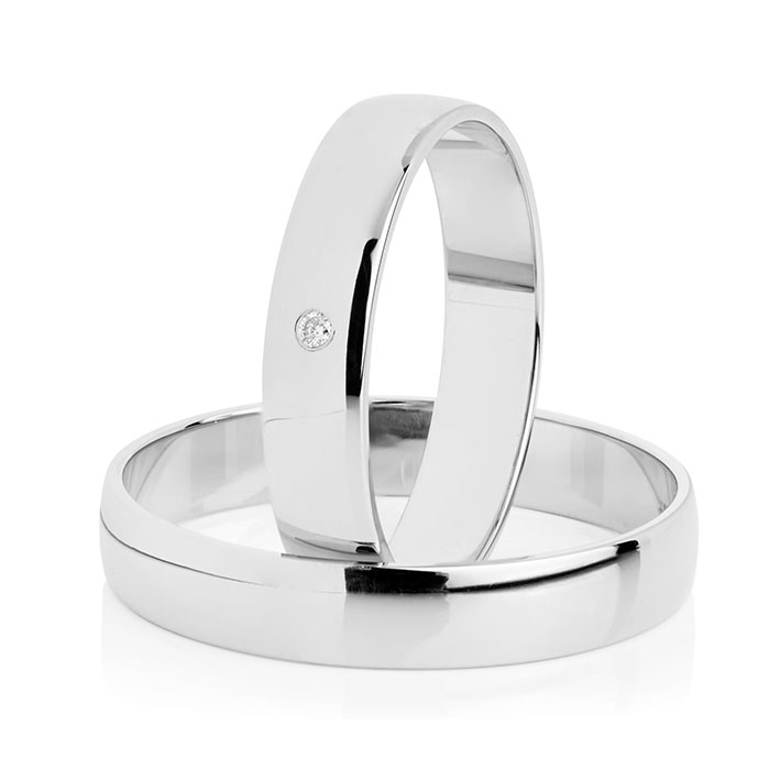 Klassiske vielsesringe i 8 kt. hvidguld med diamant 0,01 ct. w/si fattet i dameringen