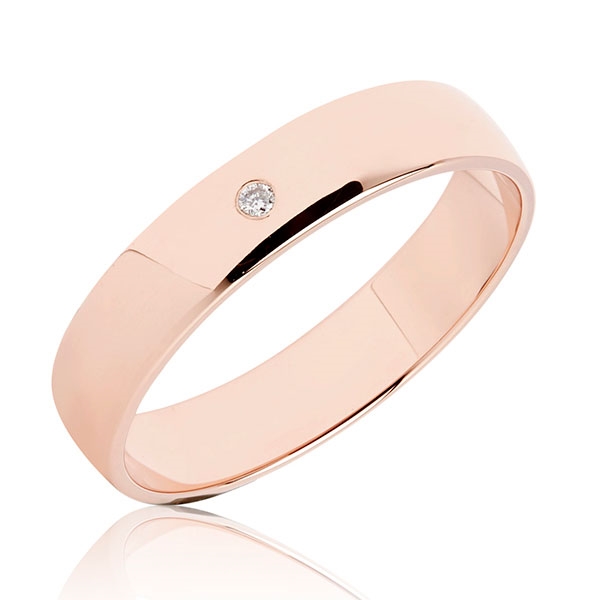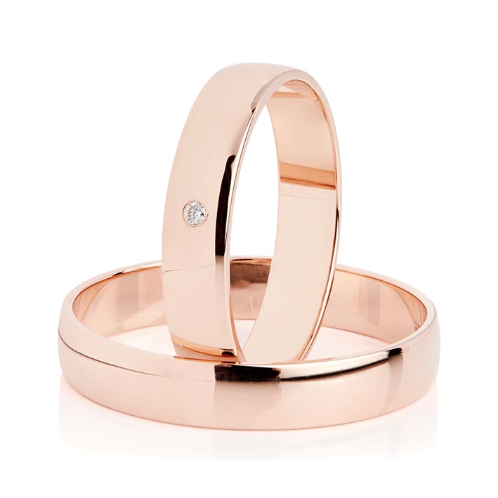 Klassiske vielsesringe i 8 kt. rosaguld med diamant 0,01 ct. w/si fattet i dameringen