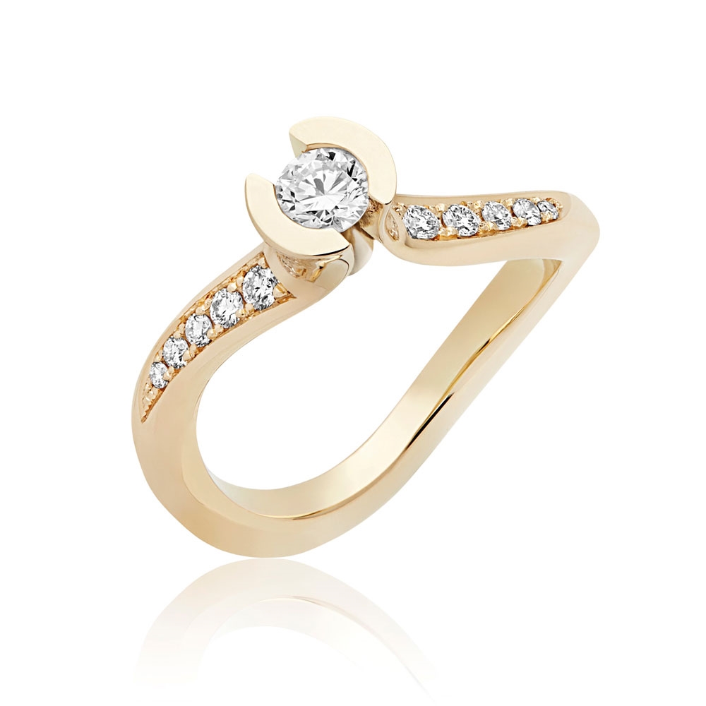 Solitairering i Guld med en brillantsleben centersten på 0,20 ct. og 10 brillanter på ringskinnen