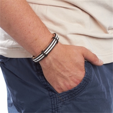 Armbåndet er i ægte brunt læder med hvide og mørkebrune tekstilbånd. Armbåndet har en praktisk snørrelås så arnbåndet kan benyttes i flere længder