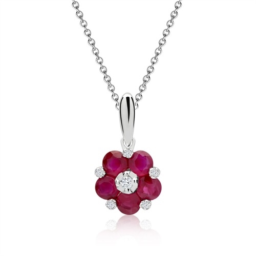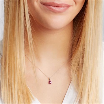 Halskæden er 42 cm lang og vedhænget er besat med rubiner og diamanter