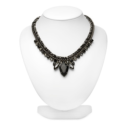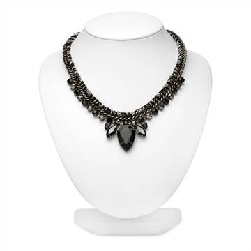 Halskæden er et flettet mix af metal og og en panserkæde med 21 smykkesten.