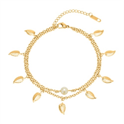 Forgyldt ankelkæde i Stål med perle og blade