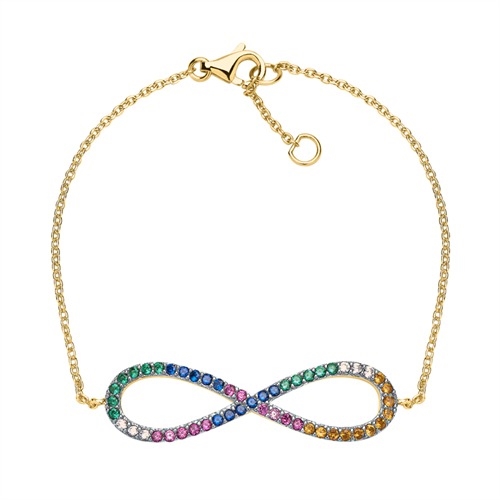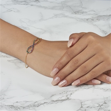 Armbåndets overflade er poleret og uendelighedstegnet er besat med talrige farvede zirkoniasten