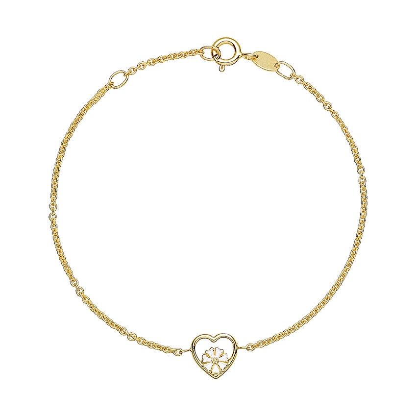 Armbåndet er med et yndigt hjerte og en hvid marguerit inden i