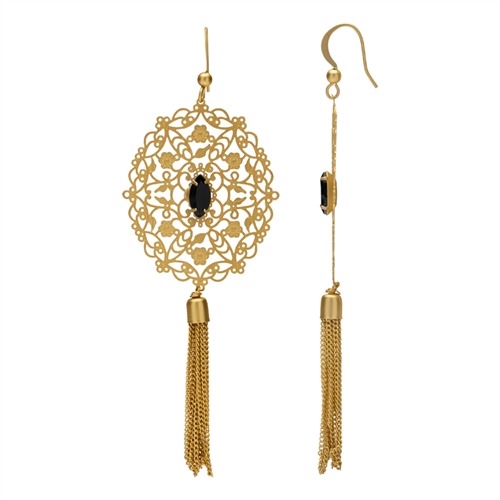 Flotte dekroative ørehænger med mat overflade. I miden en sort smykkesten og forende fjeragtige kæder
