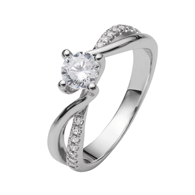 Elegant snoet ring med én stor zirkoniasten i en fatning med 4 grapper samt talrige funklende zirkoniasten på det ene bånd