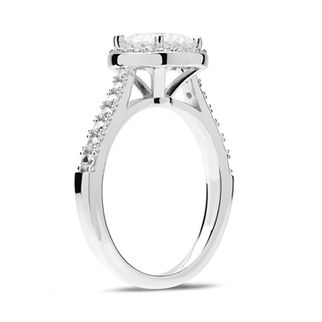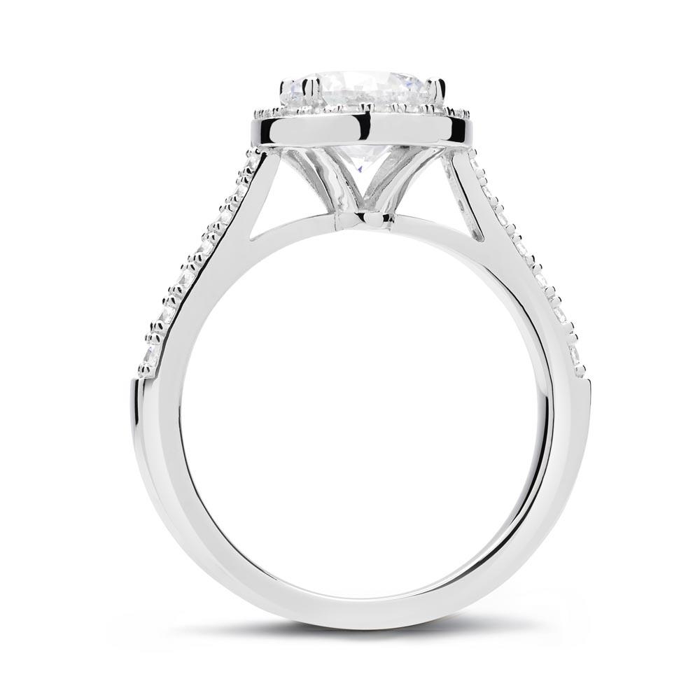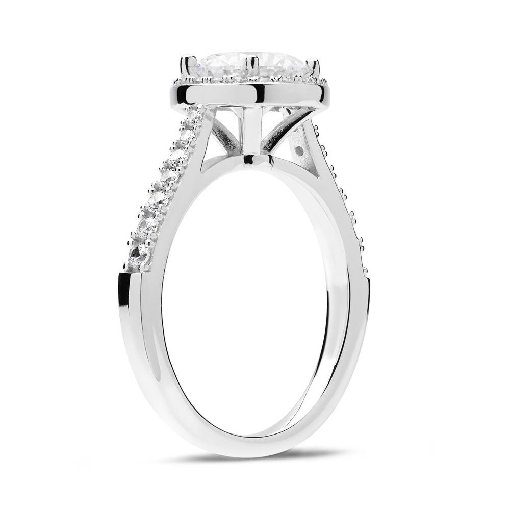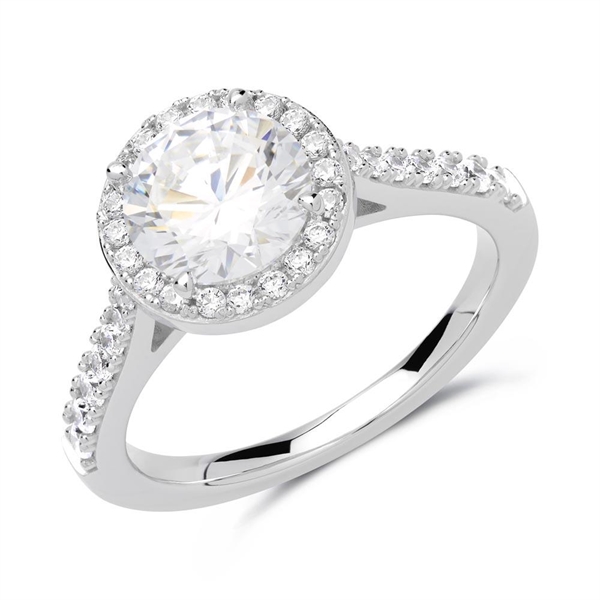 Denne elegante forlovelsesring er lavet i sterling sølv, besat med én stor rund zirkoniasten omgivet af talrige små funklende sten.