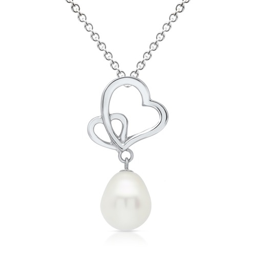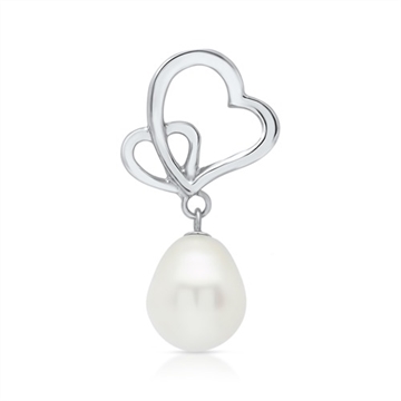 Halskæden er med 2 hjerter flettet ind i hinanden og en ægte ferskvandsperle
