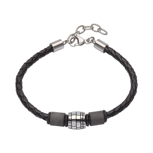 Armbåndet er i sort flettet læder med en bead i stål og på hver side 2 cylinderformede perler