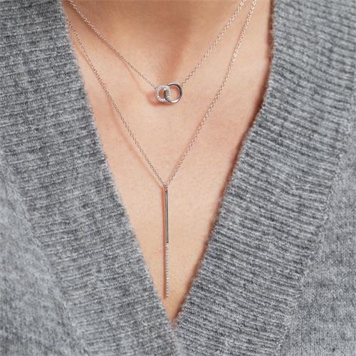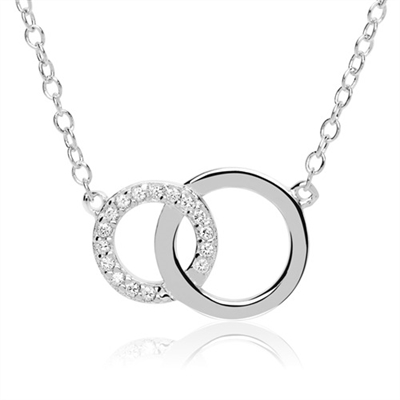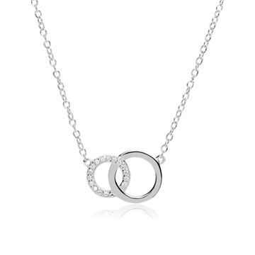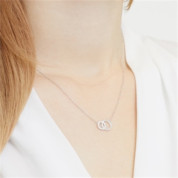 Yndig halskæde med runde ringe som vedhæng. Den ene ring er besat med funklende zirkoniasten