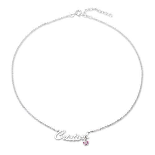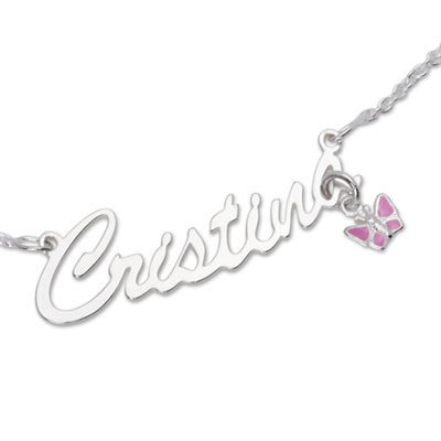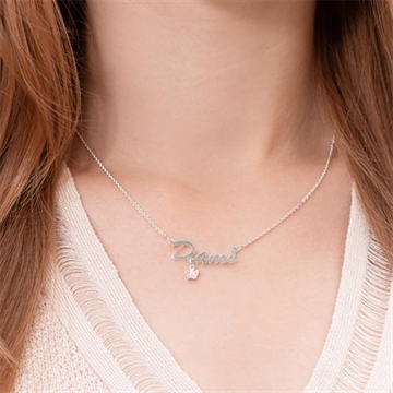 Navnehalskæde i sølv med en sommerfugl som vedhæng