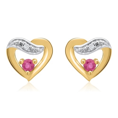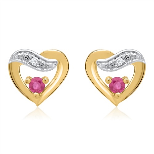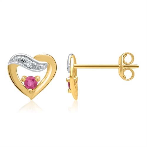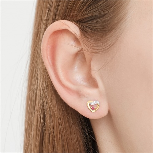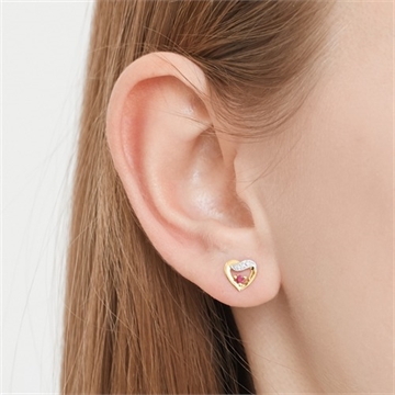 Ørestikker i hjerteformet design med 2 funklende hvide diamanter og 2 rubiner