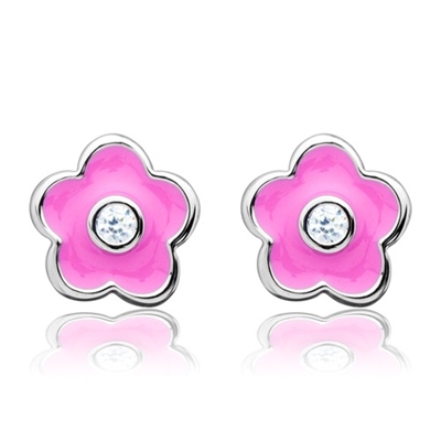 Ørestikker i sølv med lyserød blomst og besat med en zirkonia sten i midten af blomsten