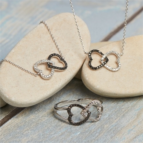 Hjerterne er flettet ind i hinanden og besat med henholdsvis 24 sorte og 24 hvide diamanter