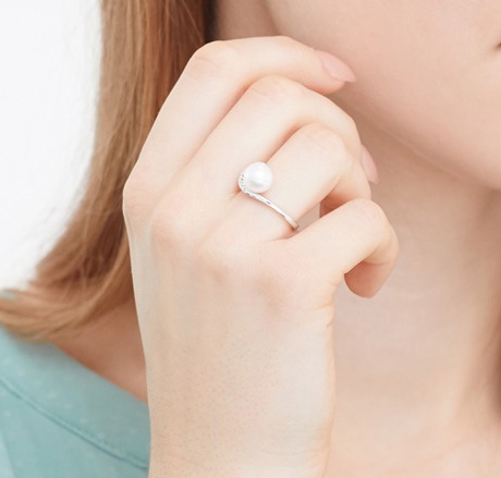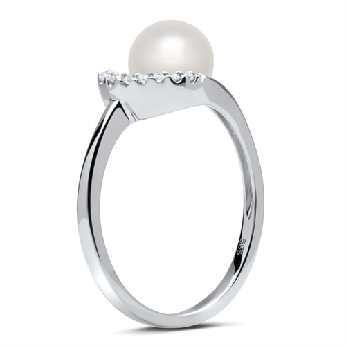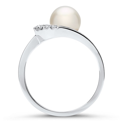 Ringen er med en fin perle i midten, omgivet af 8 hvide funklende diamanter