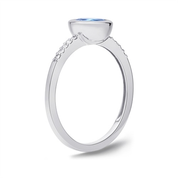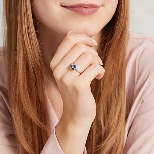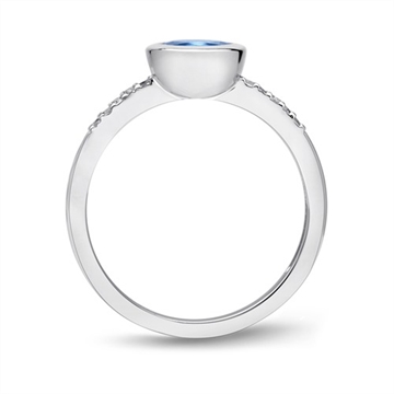 Ringen er med en rund funklende blå topas og 10 diamater på ringskinnen