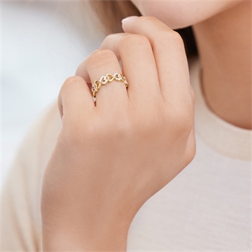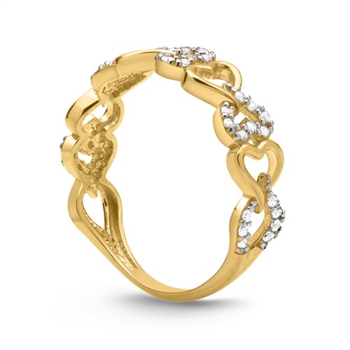 Ringen er med hjerter flettet ind i hinanden. Hjerterne er skiftevis med og uden zirkoniasten