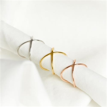 To smalle ring skinner flettet ind i et fint smykke, som danner et X i midten- deraf navnet på ringen