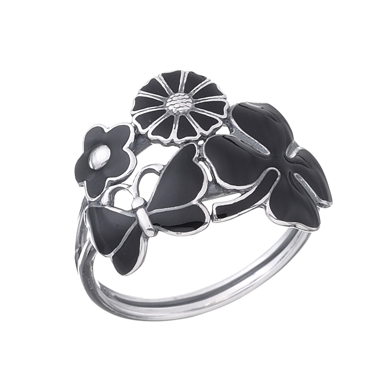 Oxyderet ring i Sølv med blomster, firkløver og sommerfugl fra Lund Copenhagen