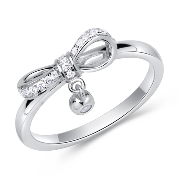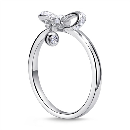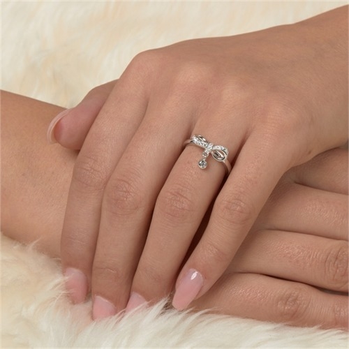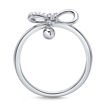 Ringen er med en elegant sløjfe besat med zirkoniasten og en lille rund kugle som vedhæng