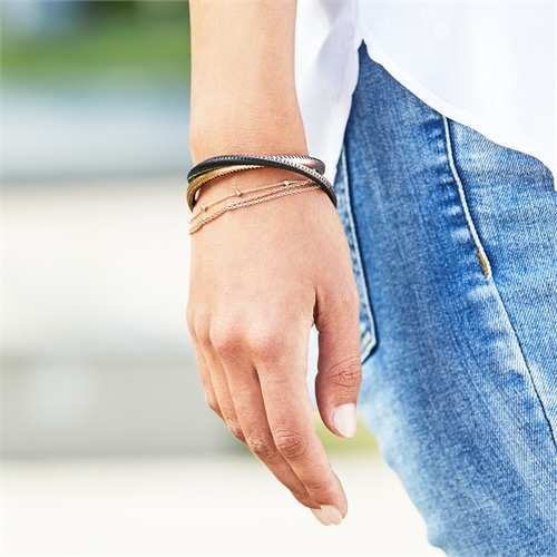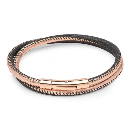 Flot læderarmbånd i rosaforgyldt og sort farve med højglans poleret stållås