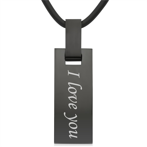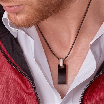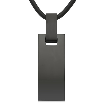 Halskæden er i gummi og vedhænget er i stål med Ionic Black Plating, hvor overfladen er højglans poleret