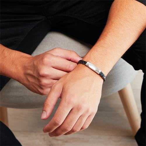 Sort læderarmbånd med stålplade og gravering