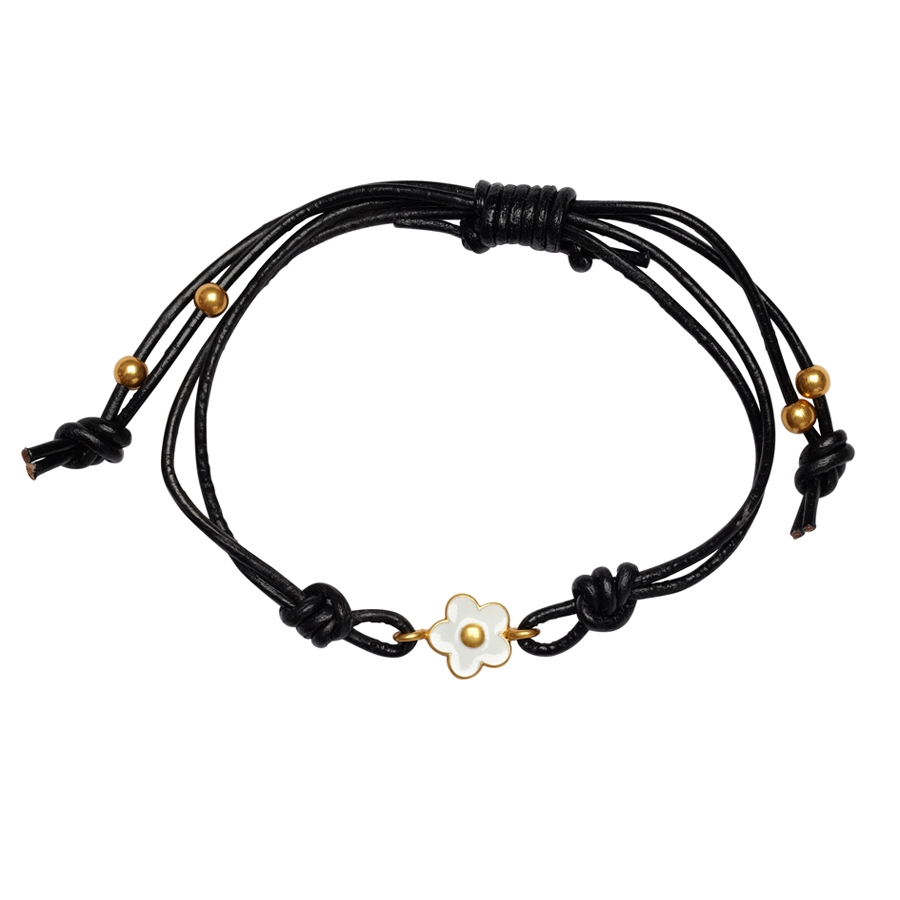 Sort læderarmbånd med hvid forgyldt blomst fra Lund Copenhagen