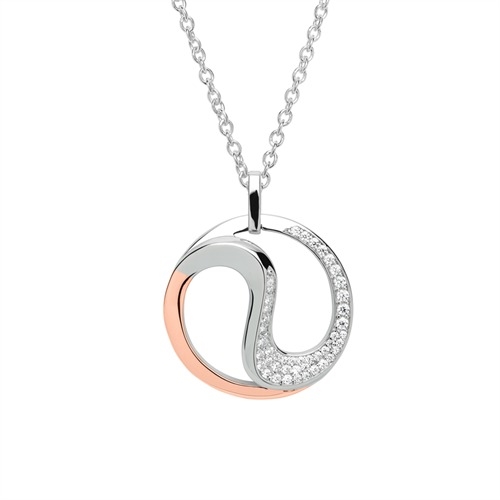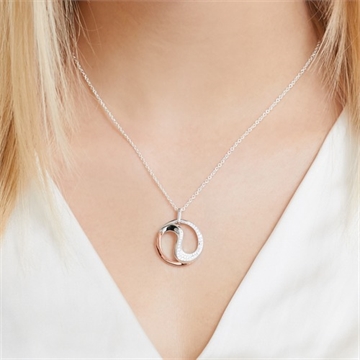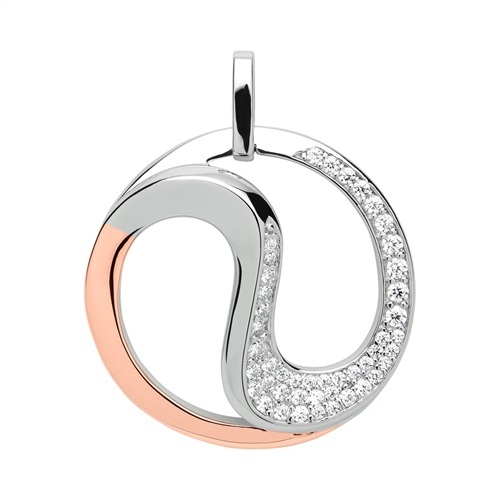 Rundt vedhæng i S-formet design. Vedhænget er besat med funklende zirkoniasten