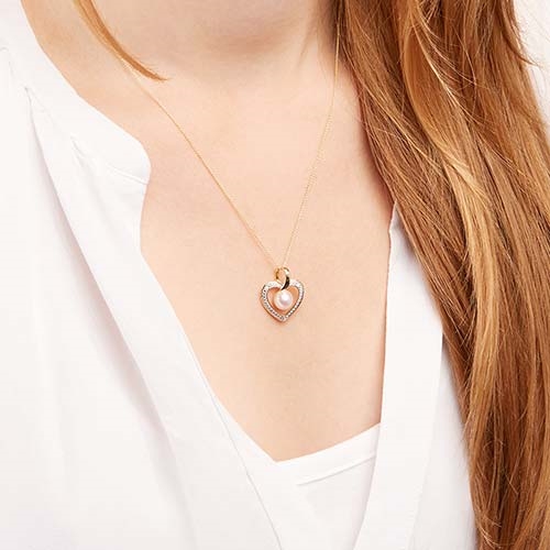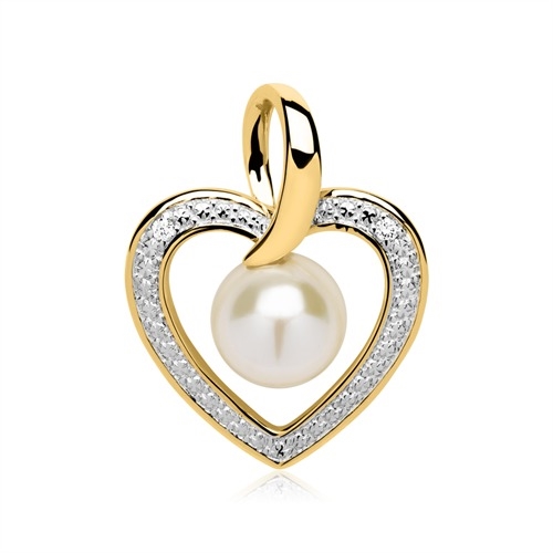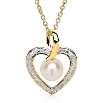 Hjertet er med en yndig hvid perle og besat med 2 brilliantslebne diamanter