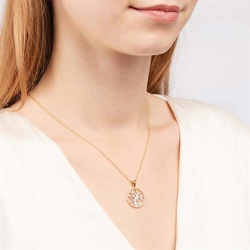 Rundt vedhæng i guld med Livets træ, hvor træet er i hvidguld og besat med zirkoniasten