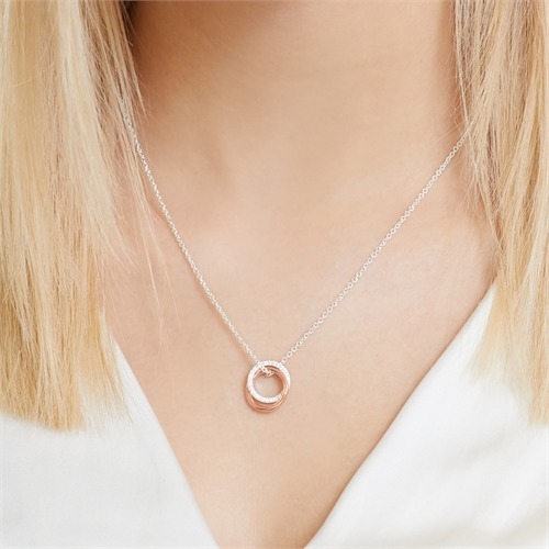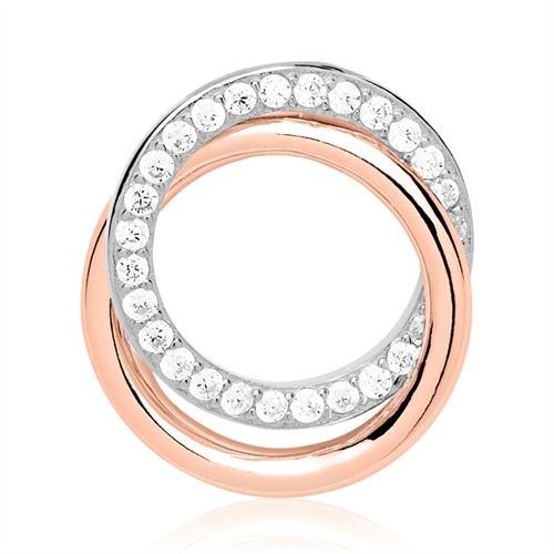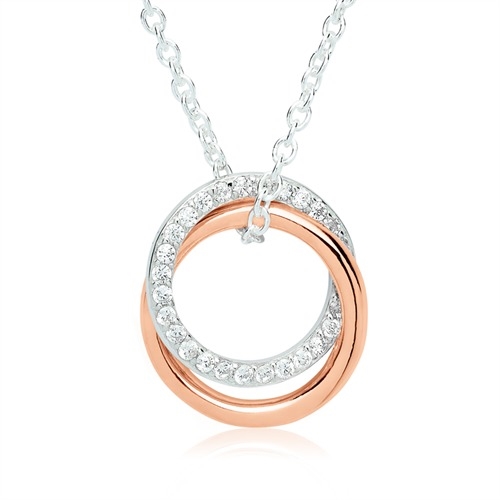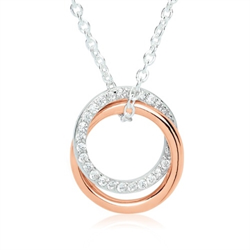 Vedhænget er med 2 ringe ringe, der er flettet ind i hinanden. Ringen i sølv er besat med funklende hvide zirkoniasten