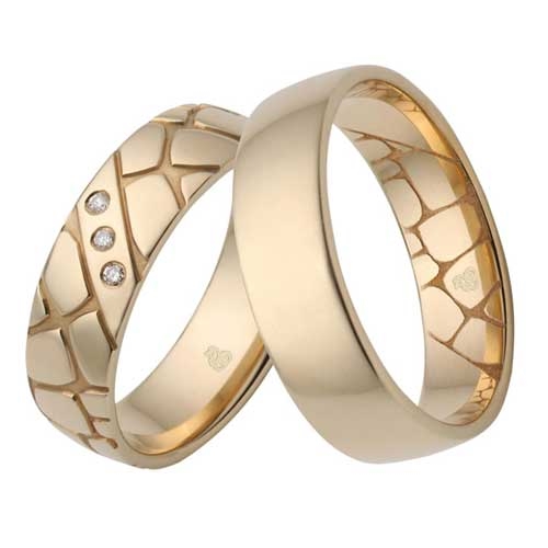 Dameringen er med 3 brillantslebne diamanter på skrå og mønster på hele ringen