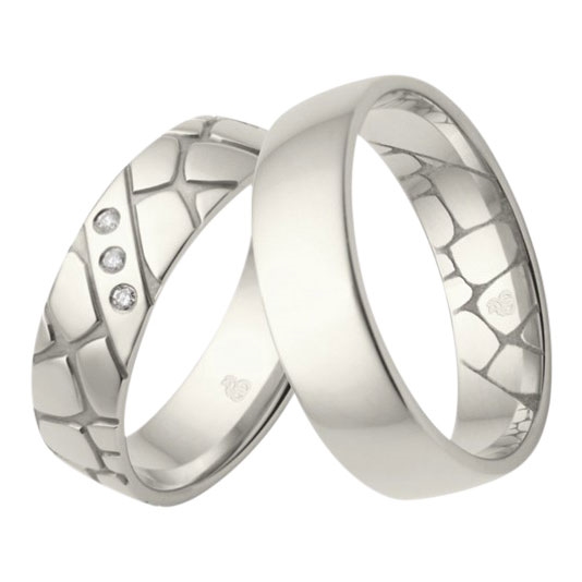 Dameringen er med 3 brillantslebne diamanter på skrå og mønster på hele ringen