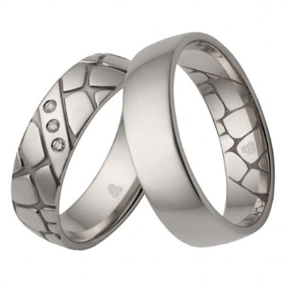 Dameringen er med 3 brillantslebne diamanter på skrå og mønster på hele ringen