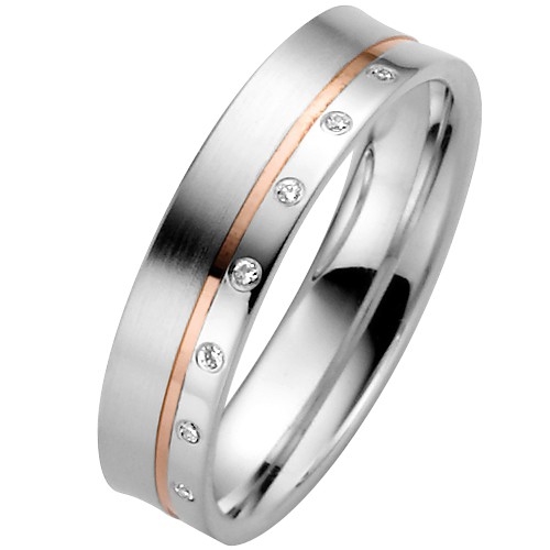 Vielsesringe i 8 kt. rødguld og hvidguld med 7 diamanter 0,035 ct. w/si fattet i dameringen