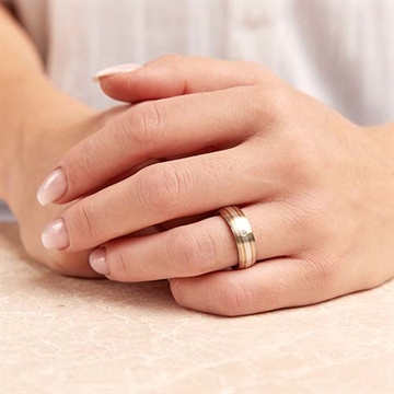 Vielsesringenes overflade er mat og med en bred rille af sølv og 2 riller af 14 karat guld