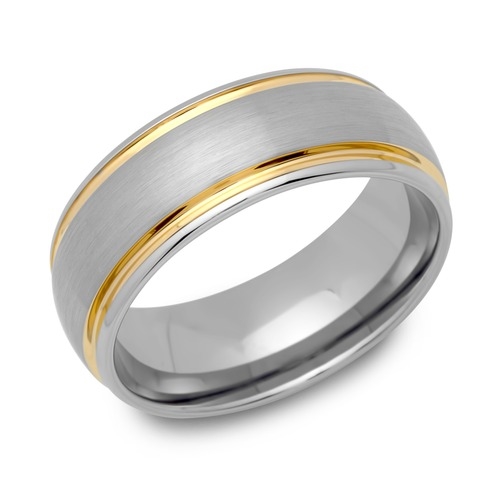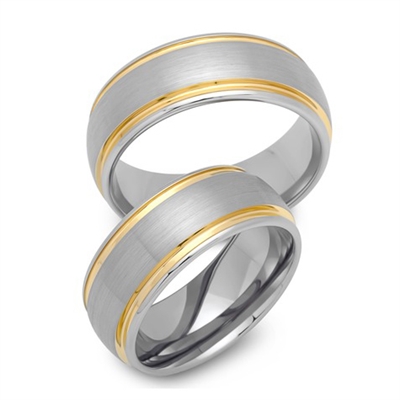 Delvis forgyldte forlovelsesringe og vielsesringe i Tungsten med udvendig gravering